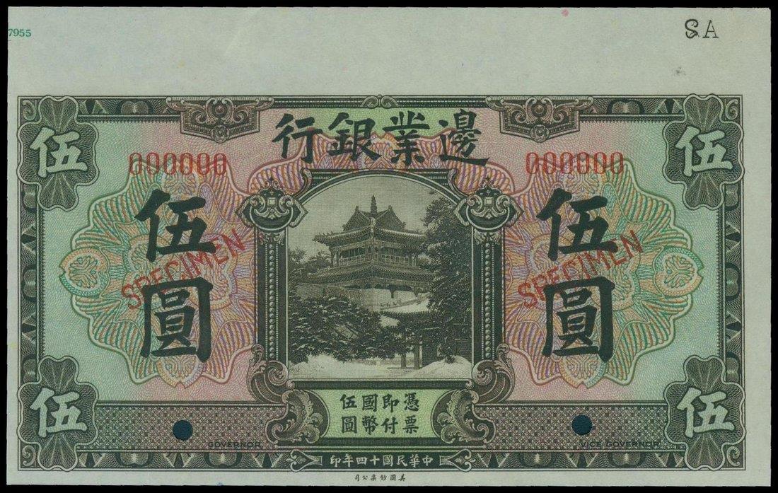 Frontier Bank, 5 yuan, 1925, serial number number 000000, brown and multicolour, Chinese city gate tower at centre, '5' at each corner, reverse brown,