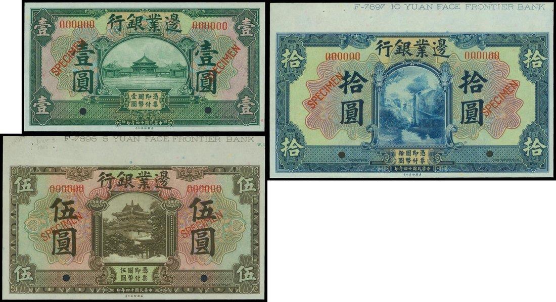 The Frontier Bank, set of 3 specimens, series of 1925, 1, 5 and 10 yuan, green, brown and blue respectively, hole punch cancelled, 'SPECIMEN' overprinted in red,