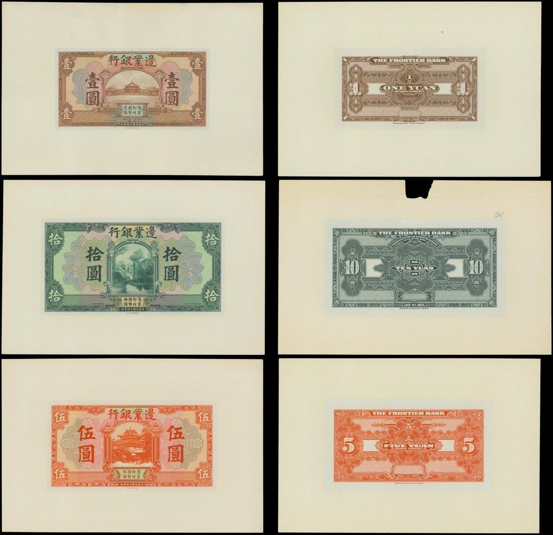 The Frontier Bank, uniface obverse and reverse proofs for 1, 5 and 10 yuan, 1925, brown, orange and green respectively, proofs mounted in large sized card,