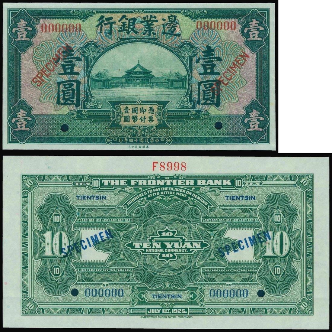 The Frontier Bank, 1 yuan, specimen, 1925, serial number 000000, green and multicolour, pavilion at centre, hole punch cancelled, 'SPECIMEN' overprinted in red, also including a uniface reverse specimen for 10 yuan, Tientsin, 1925,