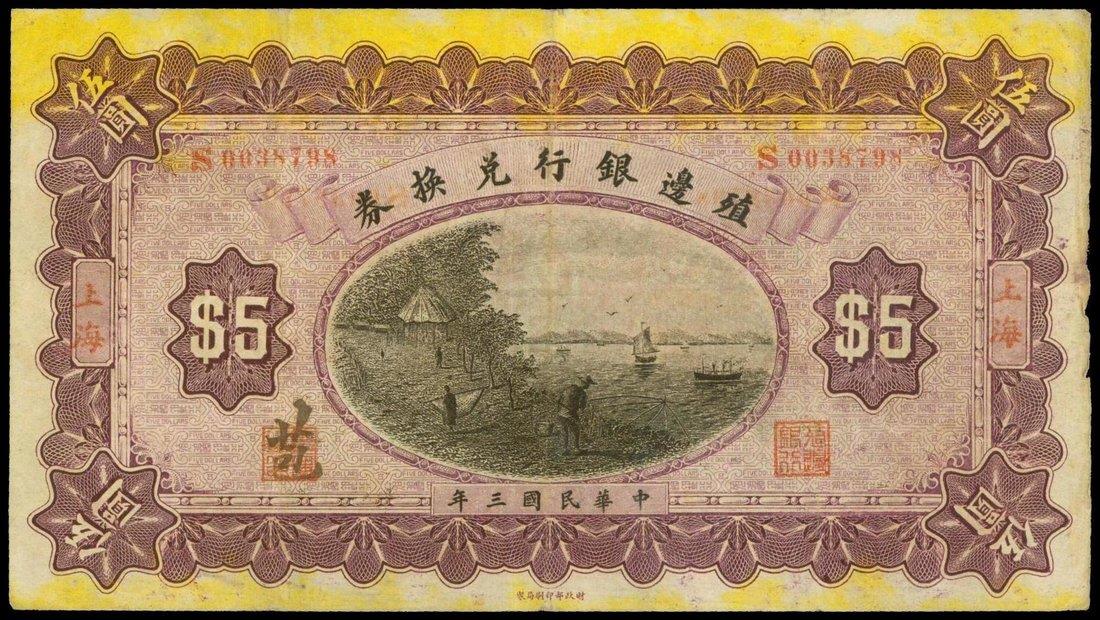 The Bank of Territorial Development,$5, 1914, Shanghai, serial number S0038798, purple on yellow underprint, black at centre, hut and fishermen along shoreline, ships at centre,