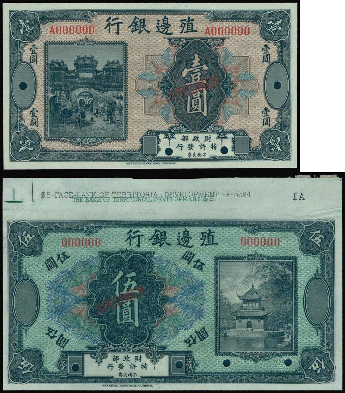 Bank of Territorial Development, pair of specimens for $1 and $5, black on orange and green respectively, Chinese city gate scenes,