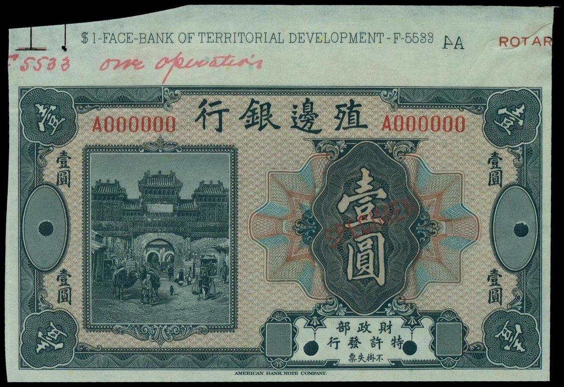 Bank of Territorial Development, $1, 1916, serial number A000000, black and orange, Pai Fang on street at left, '1' reverse brown,
