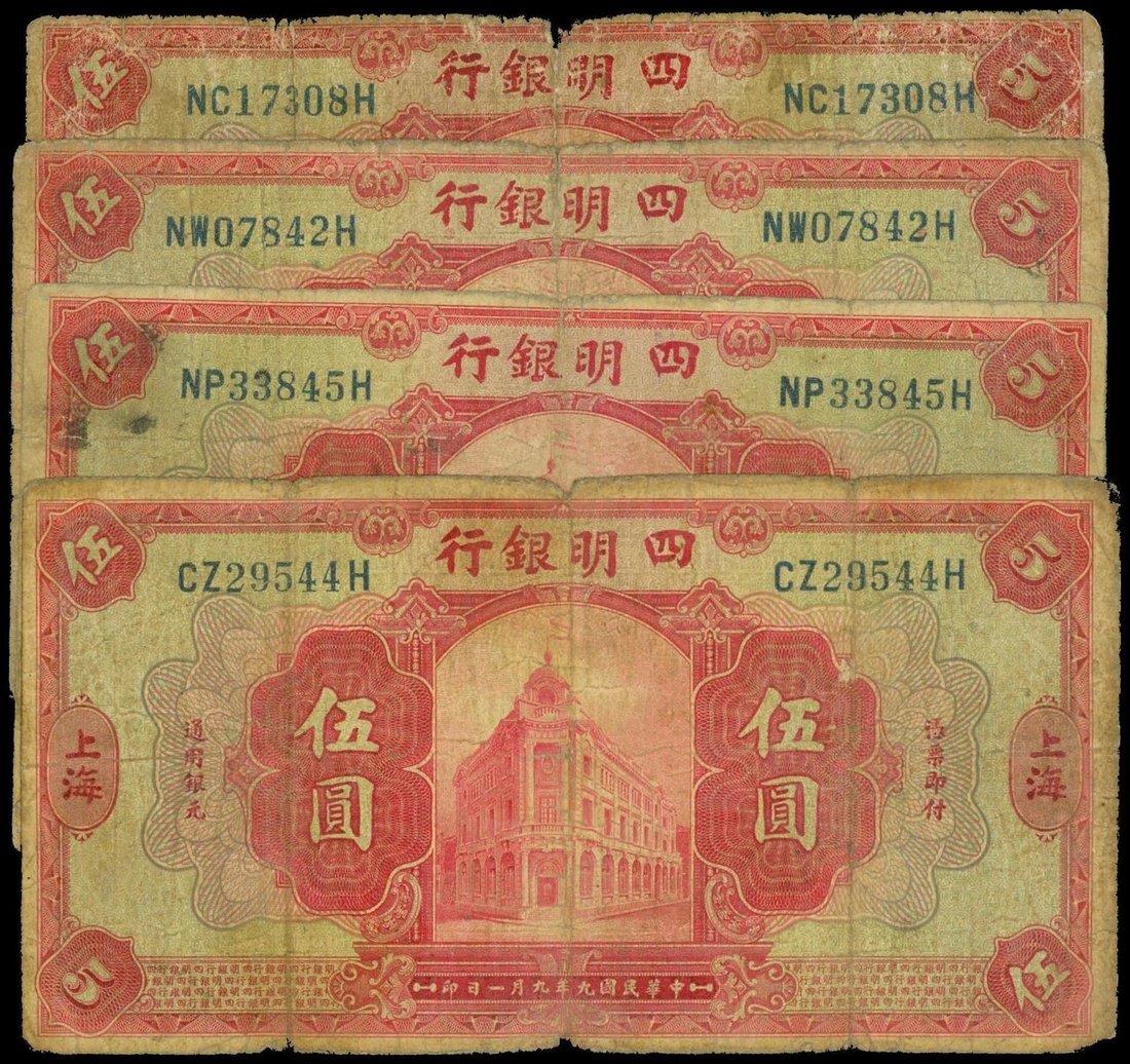 The Ningpo Commercial and Savings Bank Limited, lot of 4x $5 Local Currency, Shanghai, 1920, red on light green, bank building at centre,