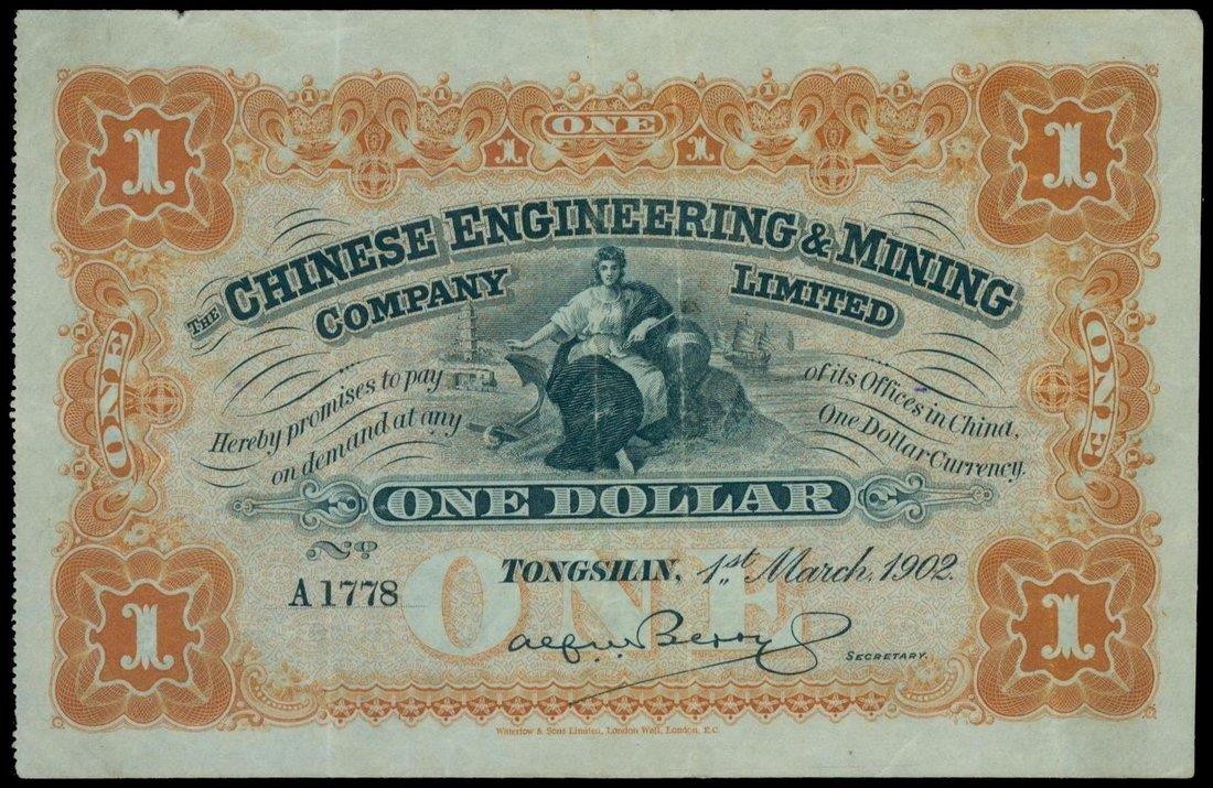 The Chinese Engineering and Mining Company Limited, $1, 1902, serial number A1778, brown and black, allegorical female centre at centre, reverse green, Chinese text,