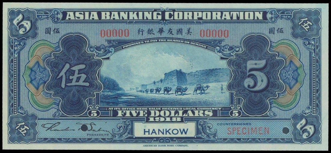 Asia Banking Corporation,$5, 1918, Hankow, specimen,blue and multicolour, camel caravan along the Great Wall at centre, reverse blue,