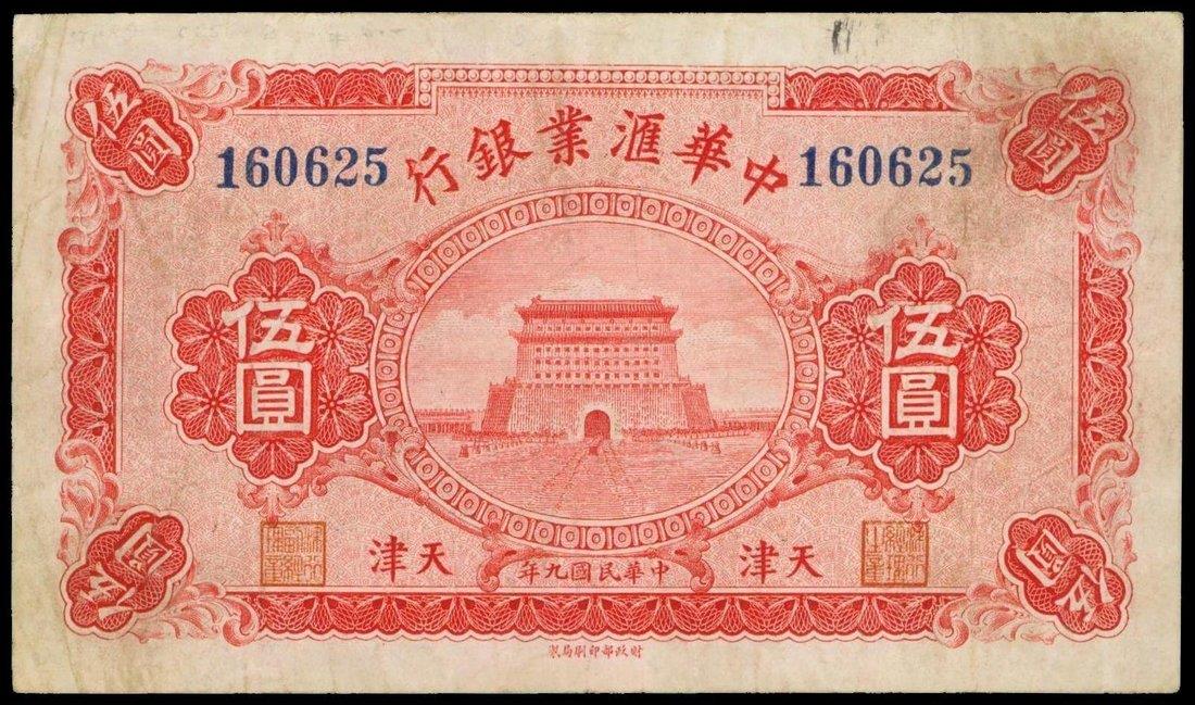 The Exchange Bank of China,$5, 1920, Tientsin, serial number 160625,red, gate fortress at centre, value left and right, reverse red, value,