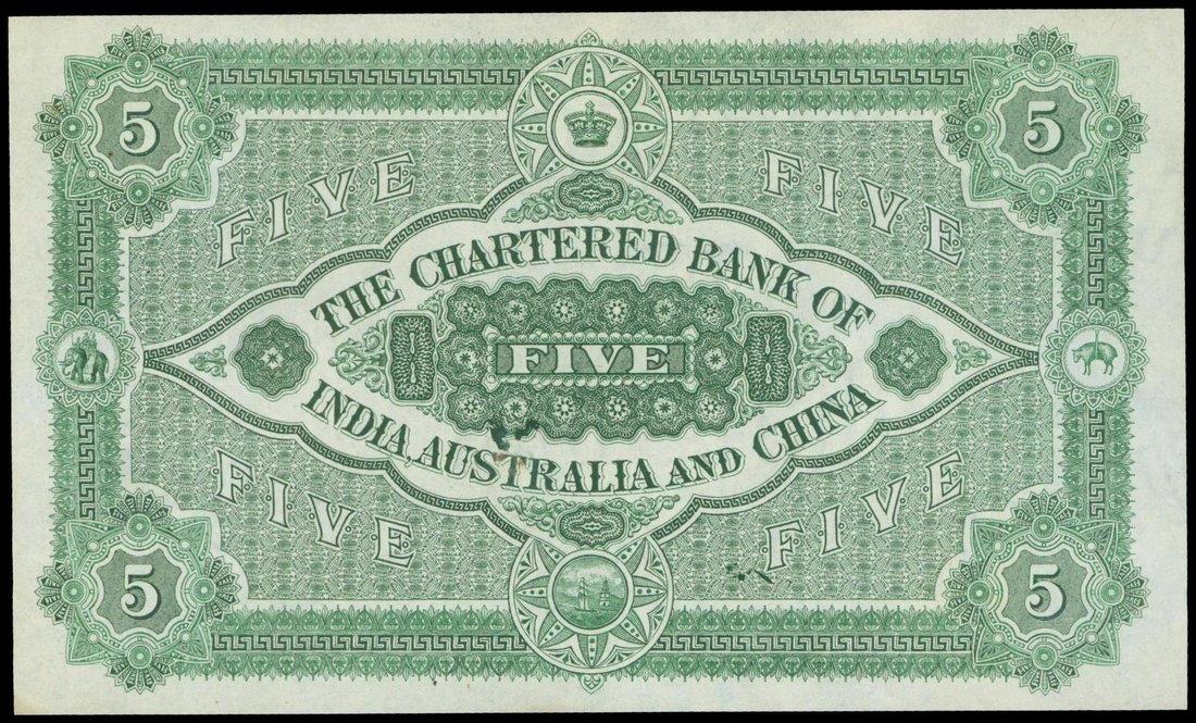 The Chartered Bank of India, Australia and China, uniface reverse proof, undated (1920's), green, '5' at each corner, elephant an ox motif left and right, bank title and "FIVE" in central panel,