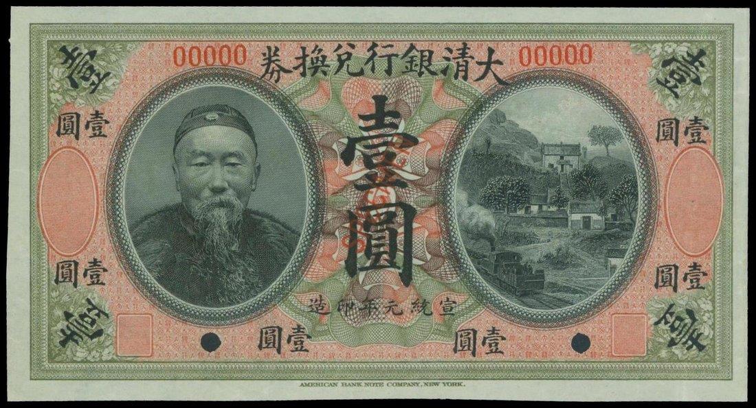 Ta Ching Government Bank, $1, specimen, 1909, serial number 00000, pink, black and green, Li Hong Zhang at left, rural scene at right, '1' in Chinese character at each corner, reverse black and brown, waterway at centre,