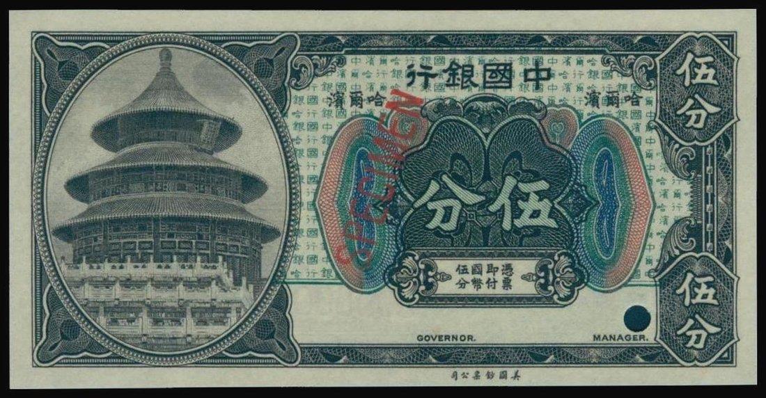 Bank of China, 5 fen, specimen, Harbin, 1918, black and multicolour, Temple of Heave at left, reverse blue-green value at centre,