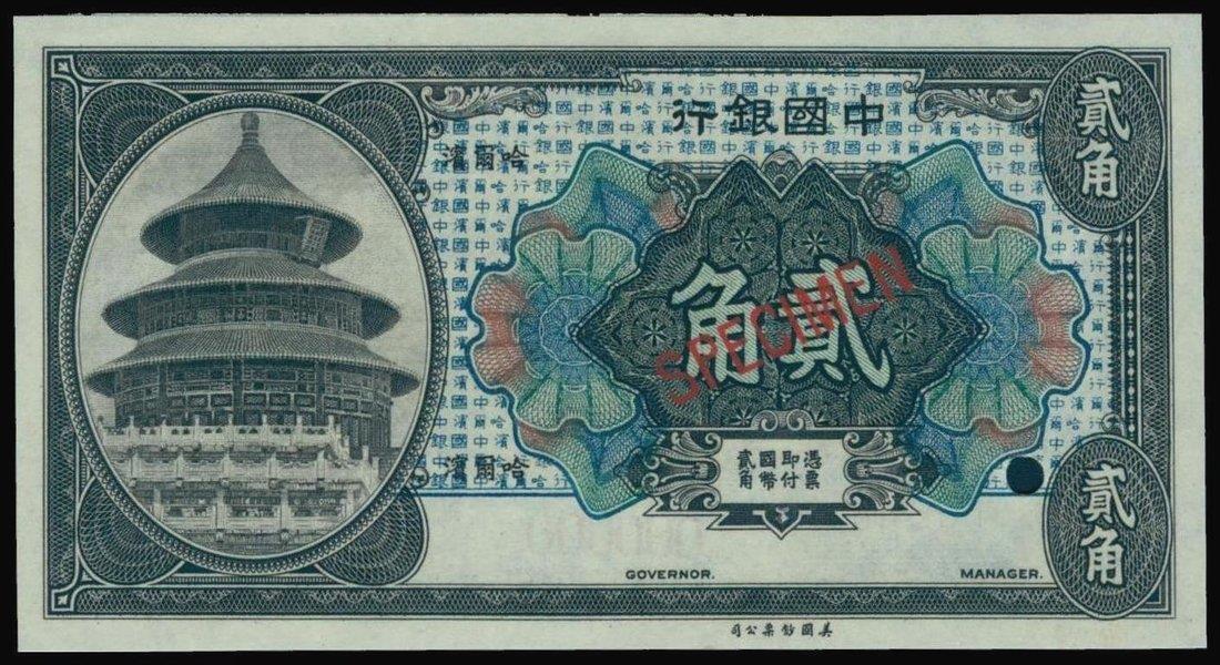 Bank of China, 20 cents, specimen, Harbin, 1918, black and multicolour, Temple of Heave at left, reverse blue, value at centre,