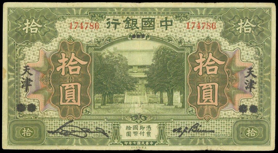 Bank of China,10 yuan, 1918, Tientsin, serial number 174786,green and multicolour underprint, temple behind trees at centre, reverse green,