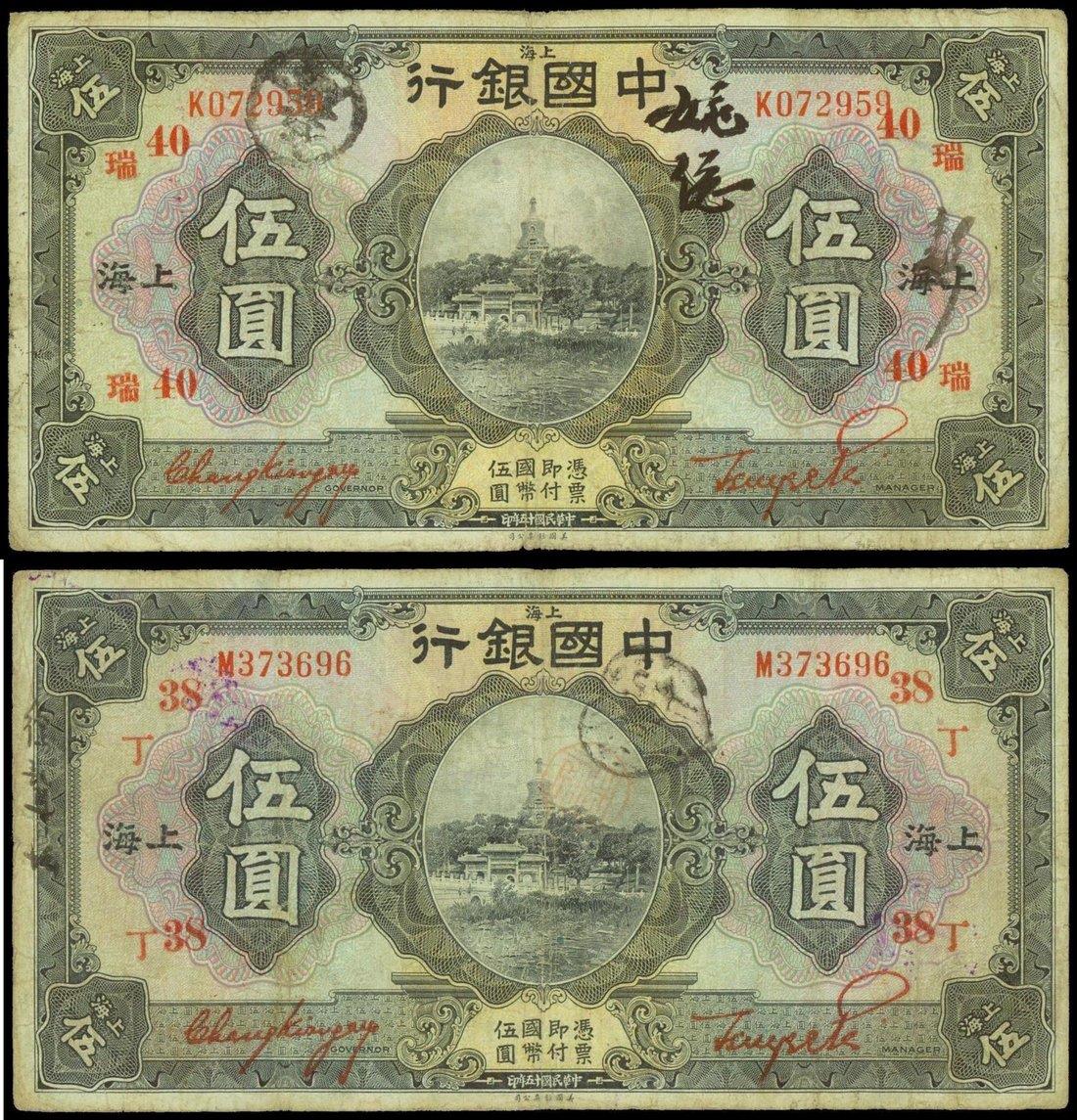 Bank of China,a pair of 5 yuan, 1926, Shanghai, serial number K072959, M373696,black green on multicolour underprint, Peking pagoda on hilltop at centre, Chinese character and numeral control overprinted on obverse and reverse,