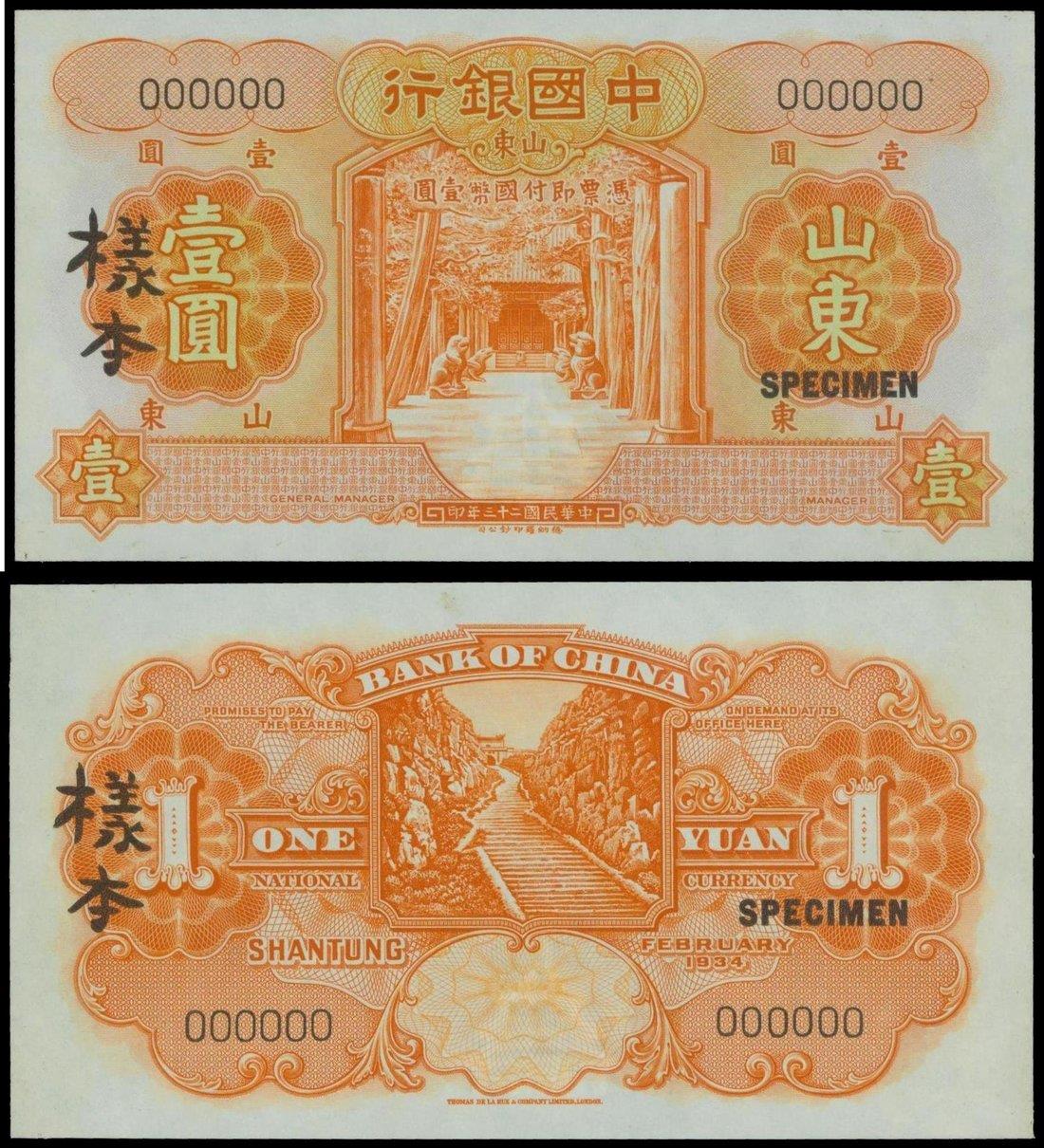 Bank of China,1 yuan, 1934, Shantung, uniface obverse and reverse specimen,orange and light green on white, colonnade at centre,
