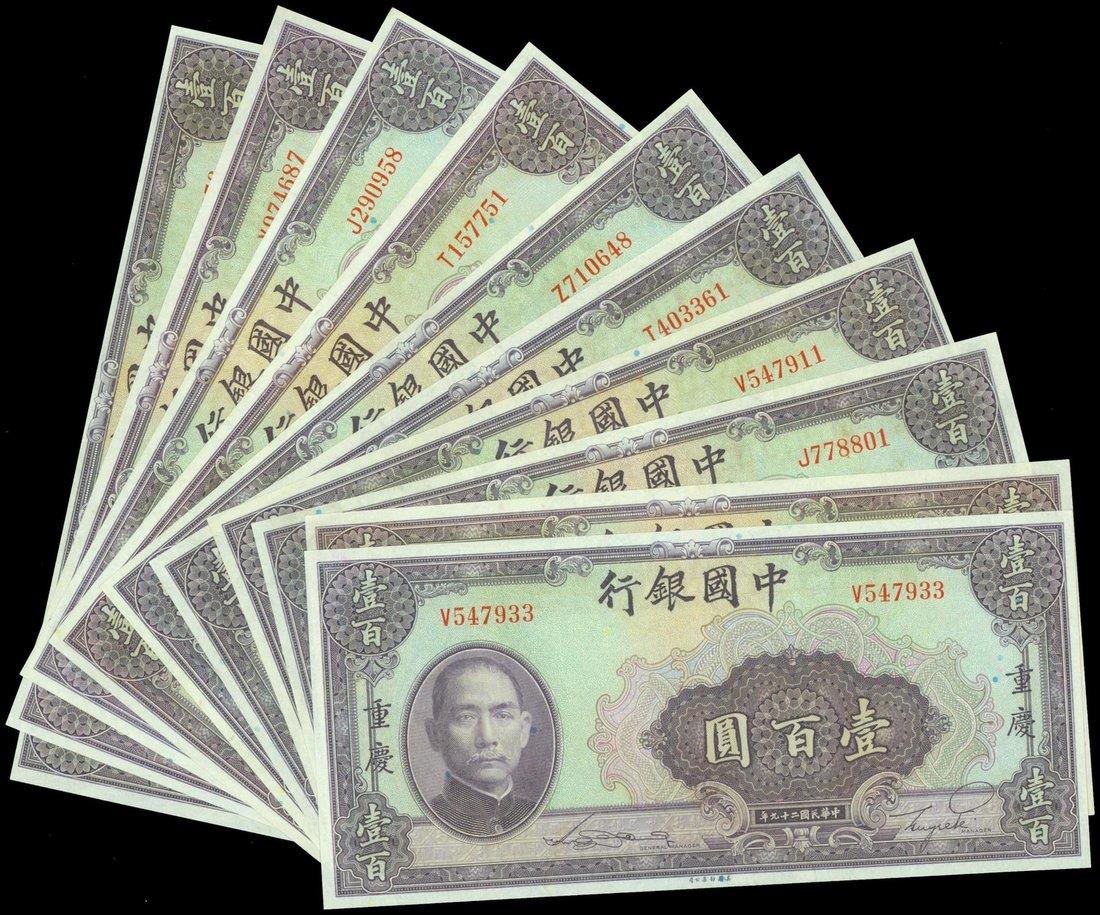 Bank of China,a lot of 10 x 100 yuan, 1940, Chungking,purple on multicolour underprint, Sun Yat Sen at left, black ‘Chungking’ overprinted left and right, reverse purple, Temple of Heaven at right,
