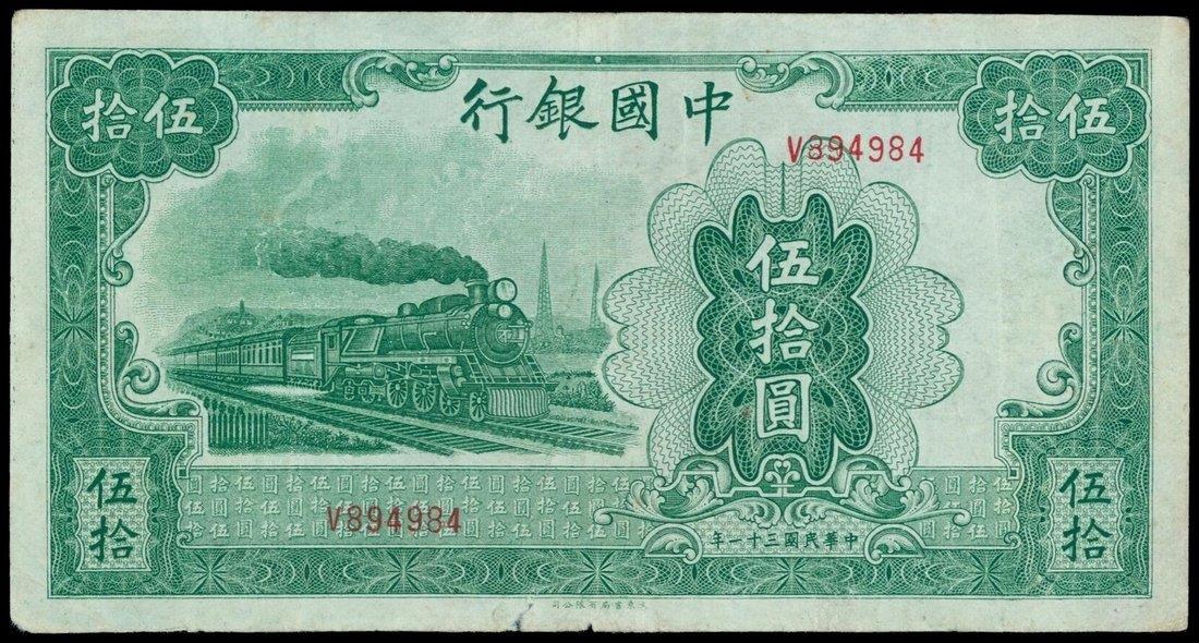 Bank of China,50 yuan, 1942, serial number V894984,green, steam train at left, reverse green,