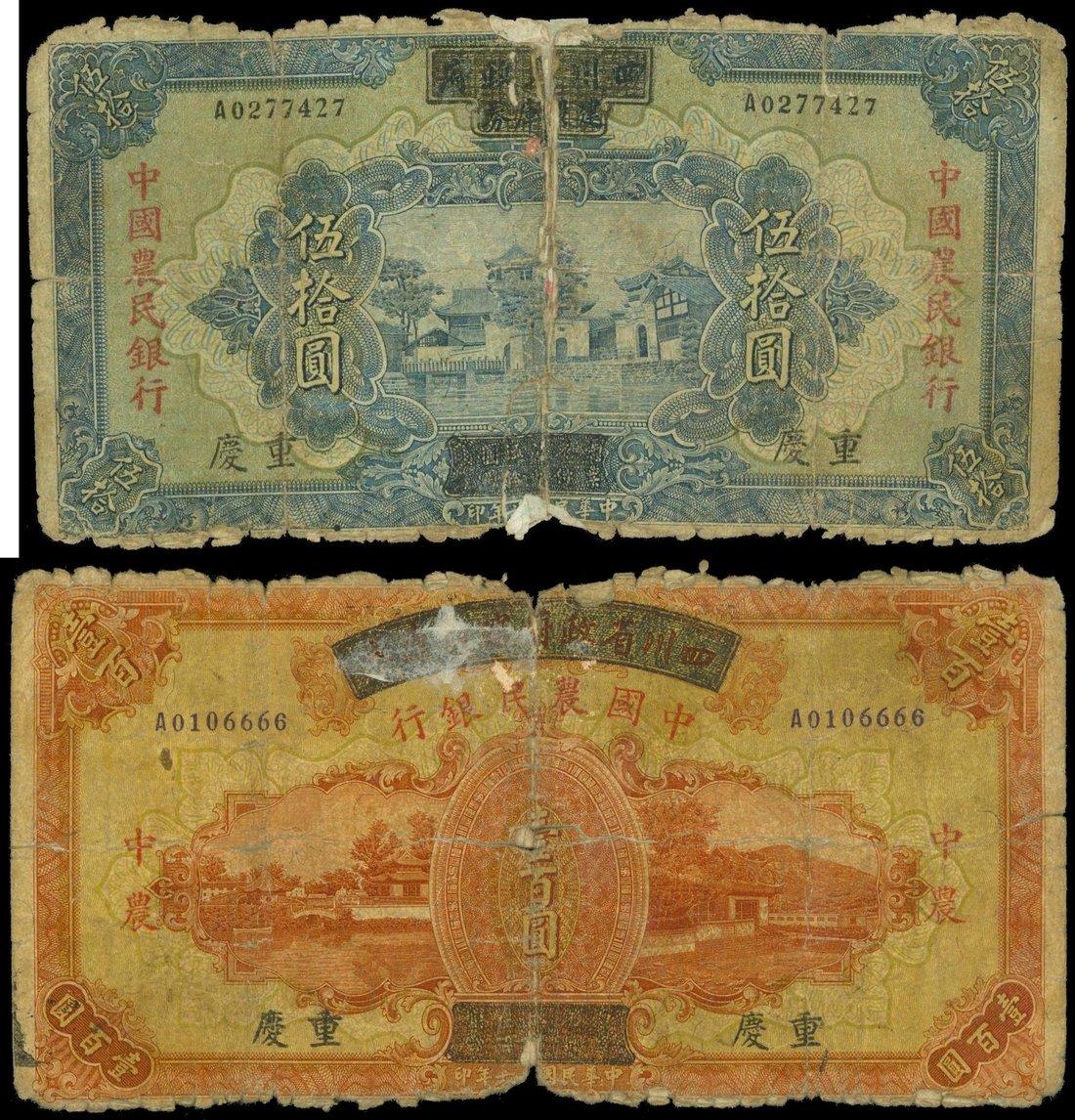 Farmers Bank of China, 1940 Fourth Provisional Reconstruction Issue, 50 and 100 yuan, bank title overprinted on Szechuan Provincial Government Issue banknotes,
