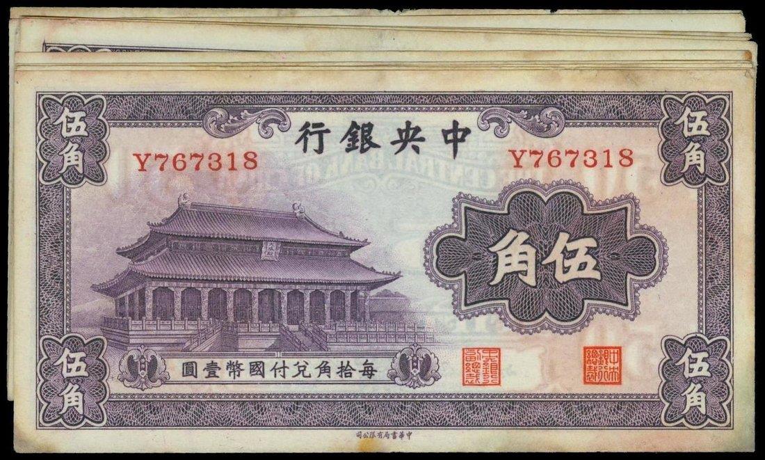 The Central Bank of China,a lot of 10 x 50 cents, ND(1931),purple, Temple of Confucius at left, reverse brown and blue,