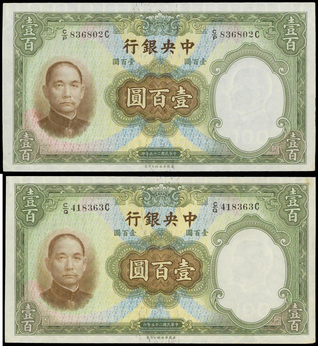 Central Bank of China,2 x 100 yuan, 1936, serial number C/Q418363C and C/P836802C,green on multicolour underprint, Sun Yat Sen at left, watermark in oval frame at right, reverse purple and pale blue, temple at centre right,