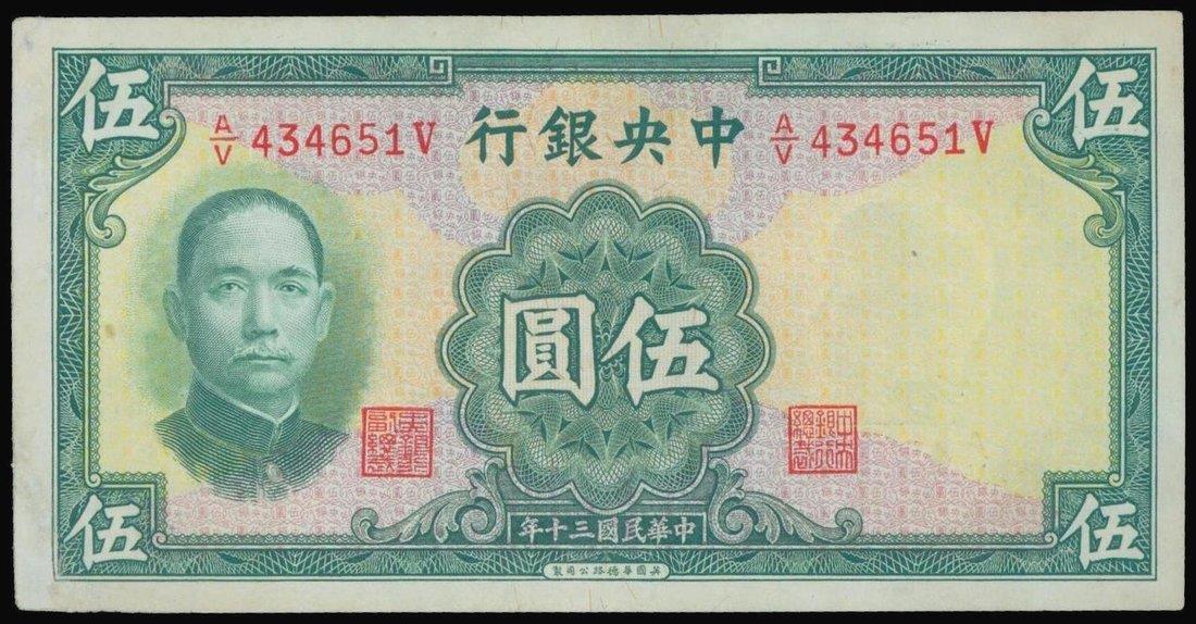 Central Bank of China,5 yuan, 1941, serial number A/V434651V,green on multicolour underprint, Sun Yat Sen at left, reverse olive,
