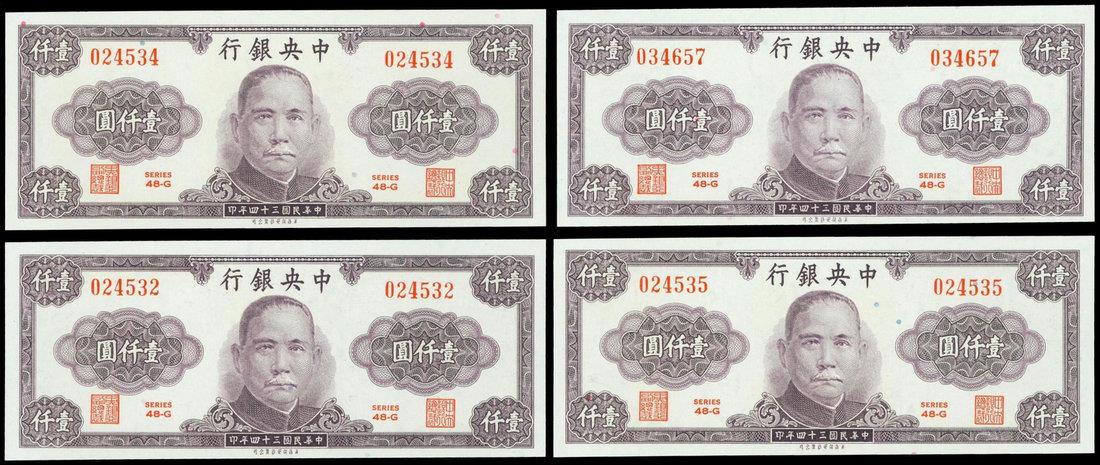Central Bank of China,a lot of 4 x 1000 yuan, 1945,purple, Sun Yat Sen at centre, value lefy and right and at four corners, red seals and serial number,
