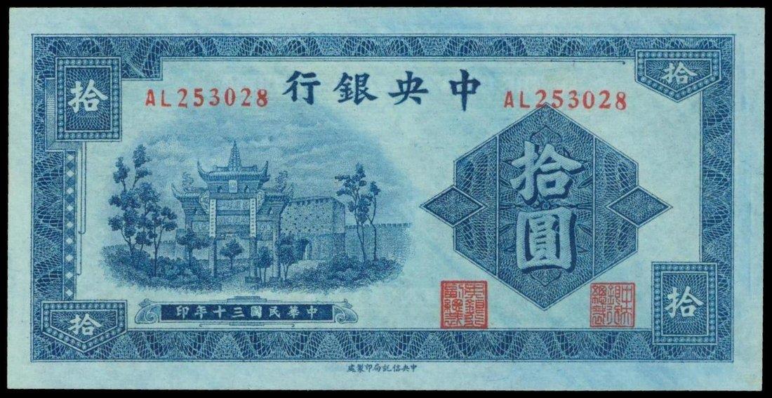 Central Bank of China,10 yuan, 1941, serial number AL 253028,blue, Pai-lou at left, reverse grey green,