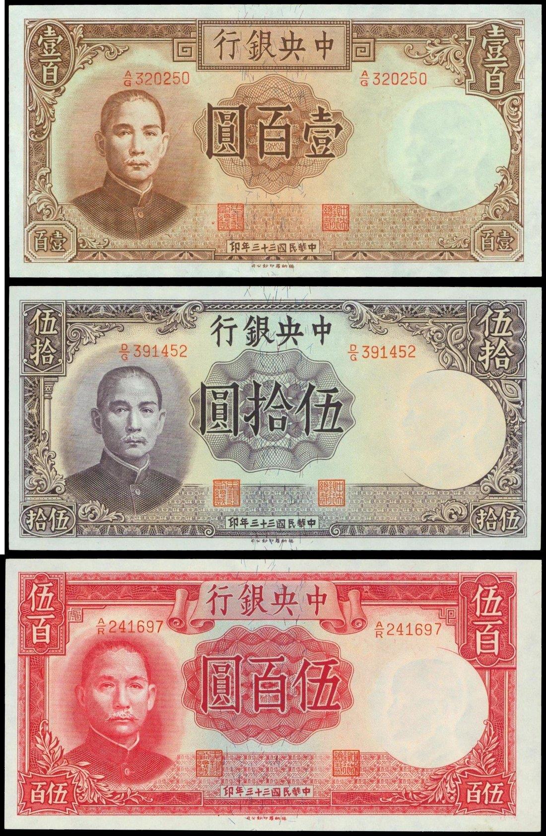 The Central Bank of China,a lot of 50, 100 and 500 yuan, 1944, serial number D/G391452, A/G320250, A/R241697,deep purple, brown and red on multicolour underprint respectively, Sun Yat Sen at left,