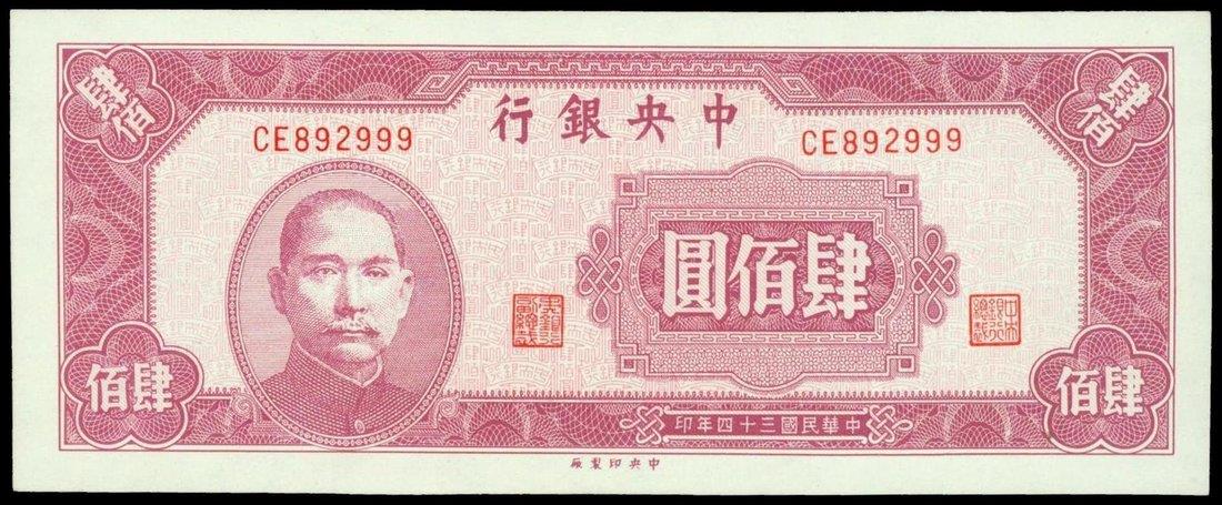 Central Bank of China,400 yuan, 1945, serial number CE892999,lilac, Sun Yat Sen at left, value at right,