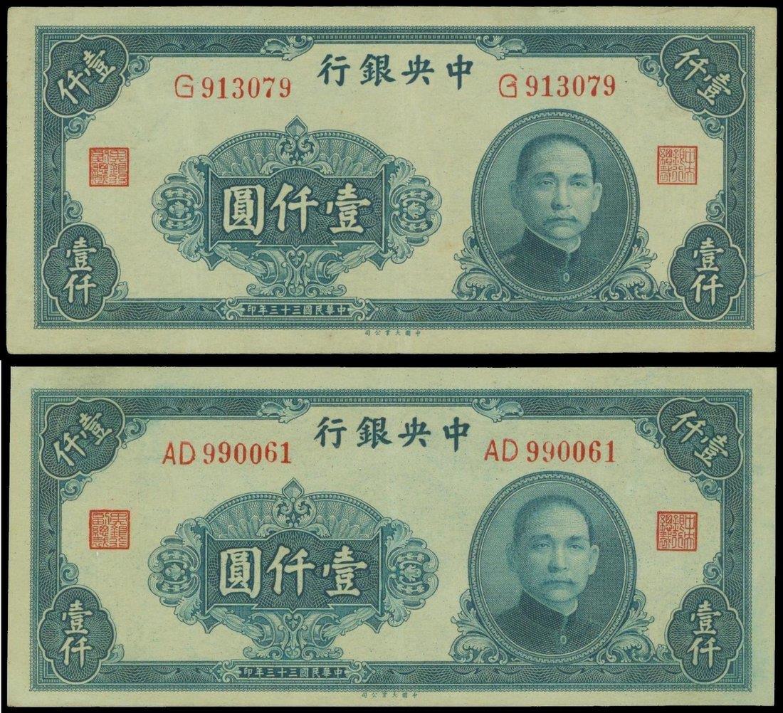 The Central Bank of China,a pair of 1000 yuan, 1944, serial number G913079, AD990061,dark green, Sun Yat Sen at right, reverse green,