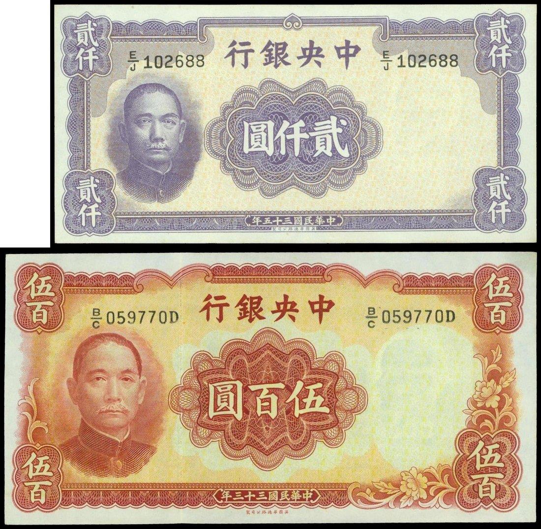 The Central Bank of China,500 and 2000 yuan, 1944 and 1946, serial number B/C059770D, E/J102688,red-brown and violet on yellow and pink underprint respectively, Sun Yat Sen at left,