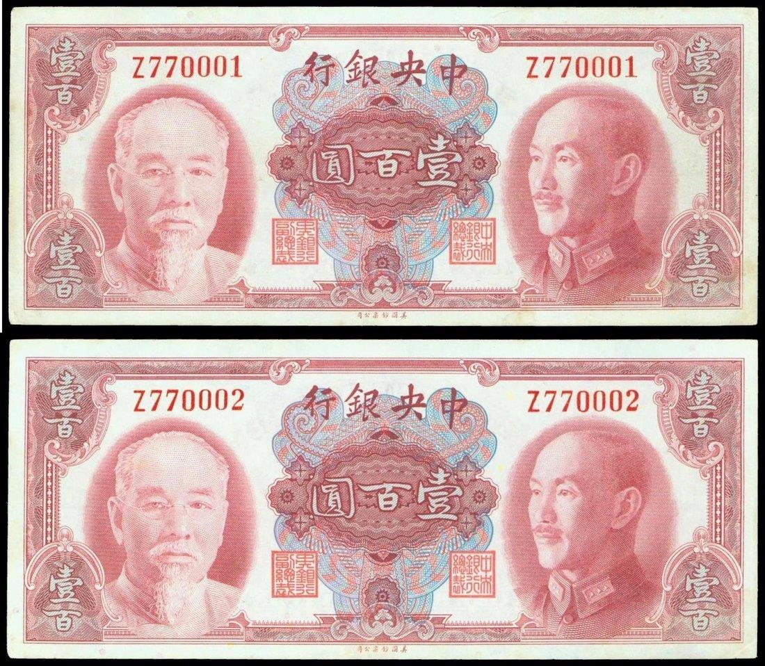 The Central Bank of China,consecutive pair of 100 yuan, 1945, serial number Z770001-2,red on multicolour, Lin Sun at left, Chiang Kai Shek at right, reverse red,