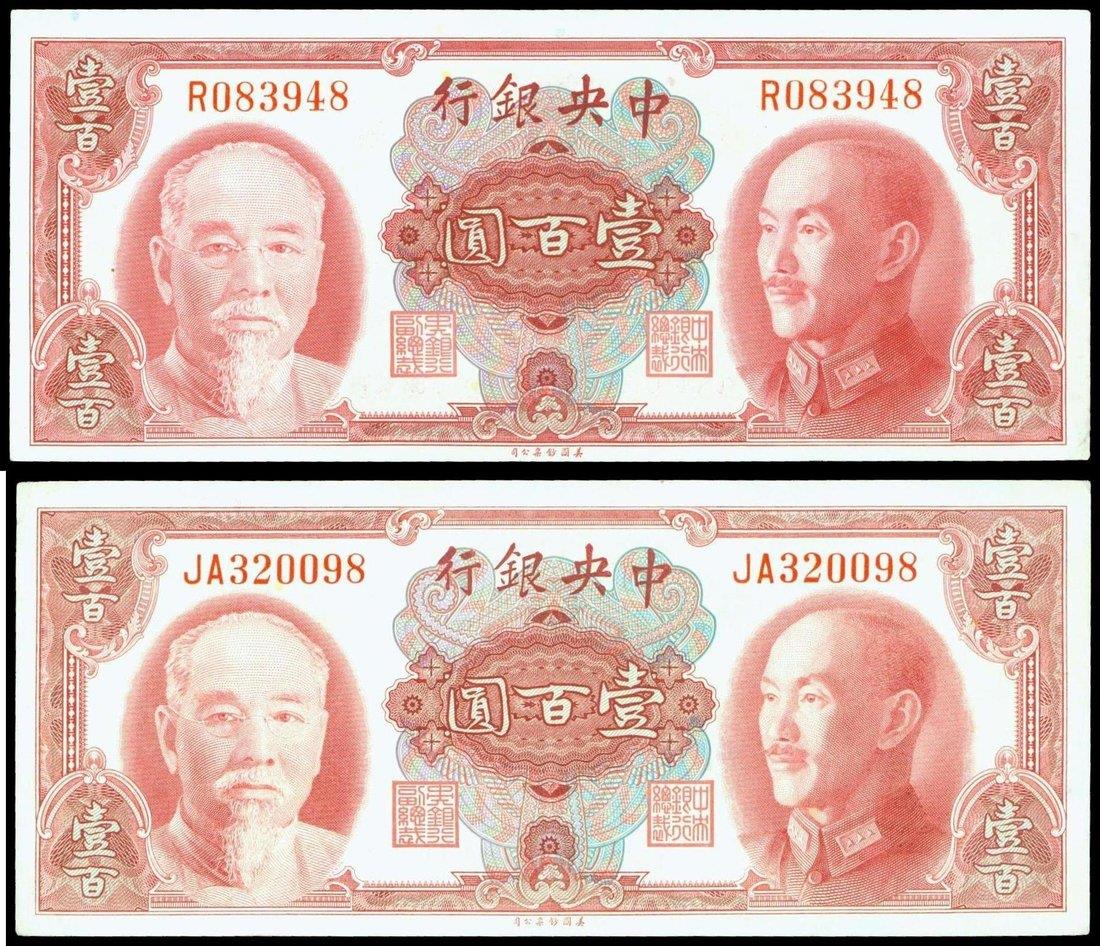 The Central Bank of China,a pair of 100 yuan, 1945, serial number R083948, JA320098,red on multicolour, Lin Sun at left, Chiang Kai Shek at right, reverse red,