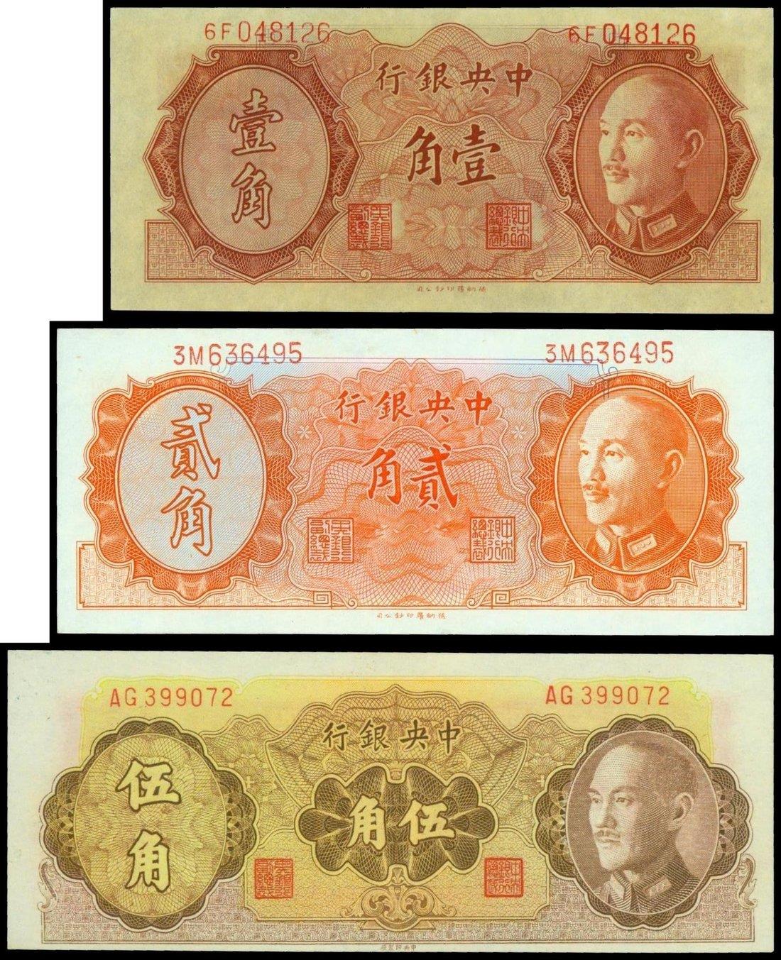 The Central Bank of China,lot of 10, 20 and 50 cents, 1946,1948, serial number 6F048126, 3M636495, AG399072,red brown, orange, dark brown respectively,Chiang Kai Shek at right,