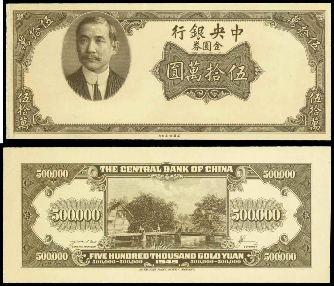 Central Bank of China,uniface obverse and reverse die proof of 500,000 gold yuan, 1949, unissued,black on white, bust of Sun Yat Sen at left on obverse, reverse black, people walking on stone bridge at centre,