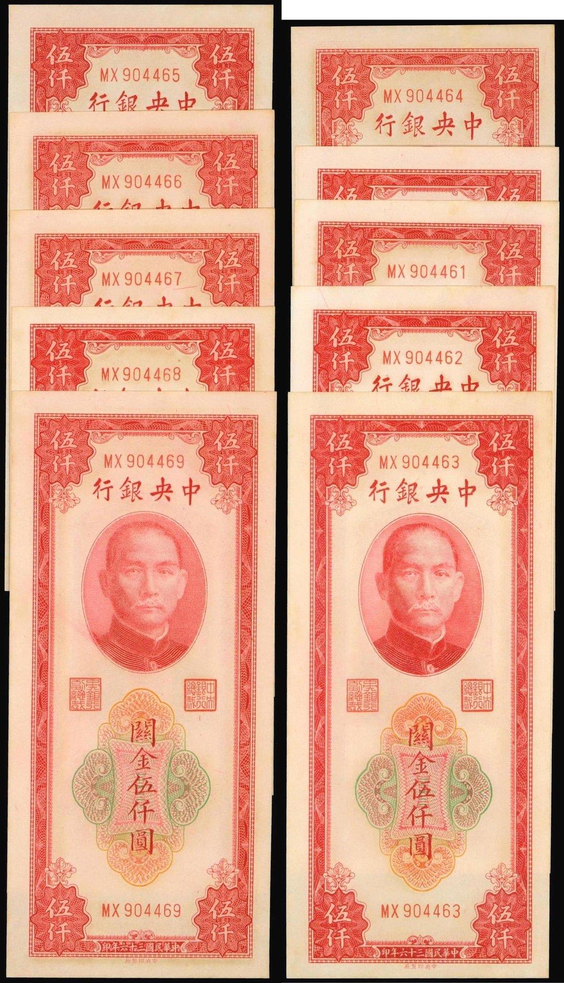 Central Bank of China,consecutive run of 10 x 5000 CGU, 1947,vertical format, red and multicolour, Sun Yat Sen at upper centre, reverse red, bank building at upper centre,