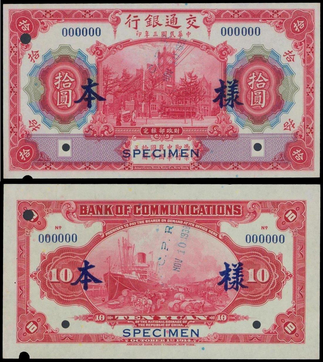 Bank of Communications, 10 yuan, uniface obverse and reverse specimen, 1914, red and multicolour, Customs Maritime Building at centre,dockside scene on reverse,
