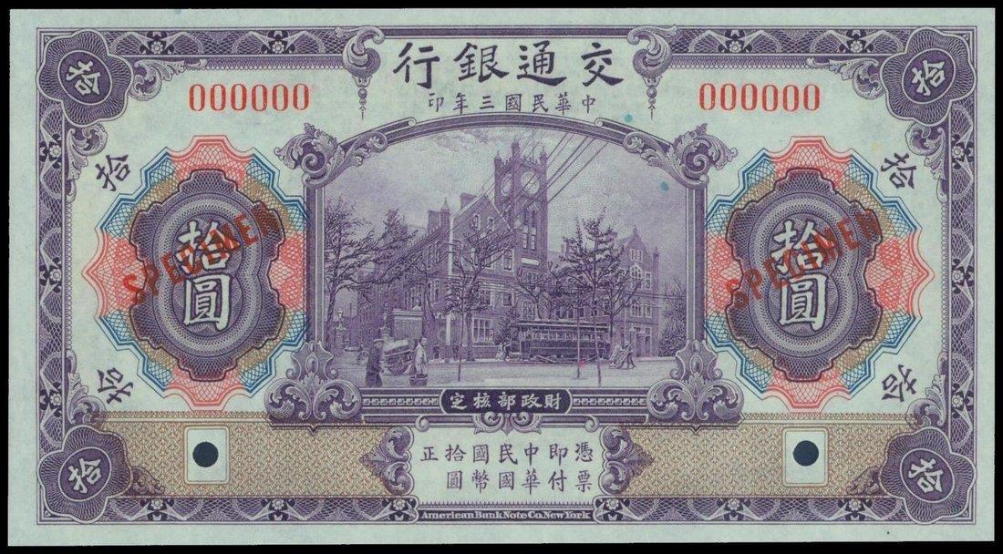 Bank of Communications,10 yuan, 1914, specimen,purple and multicolour underprint, custom house at centre, reverse purple, ship and train at centre,