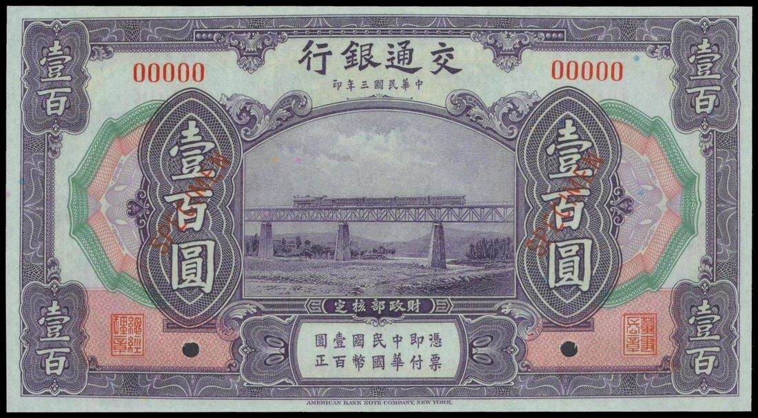 Bank of Communications,100 yuan, 1914, specimen,purple and multicolour underprint, train on bridge at centre, reverse purple, steam train at centre,
