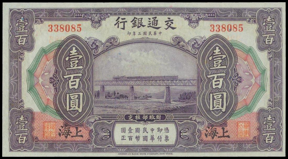Bank of Communications,100 yuan, 1914, serial number 338085,purple and multicolour, train on bridge at centre, reverse purple, steam train at centre,