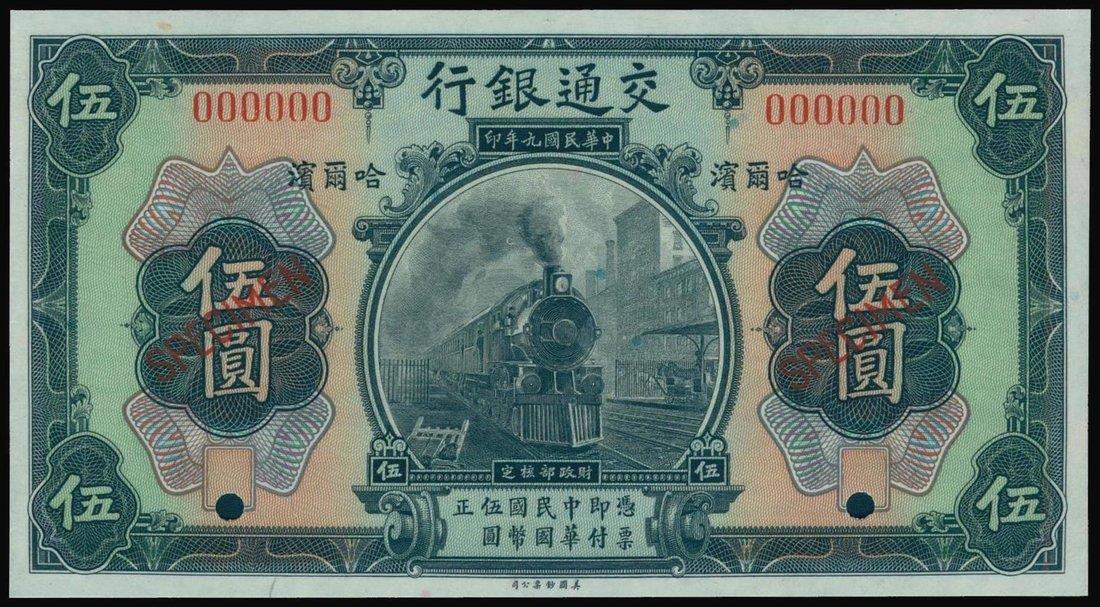Bank of Communications, 5 yuan, specimen, Harbin, 1920, black, on green and orange, steam locomotive at centre, reverse black, Maritime Customs building at centre,