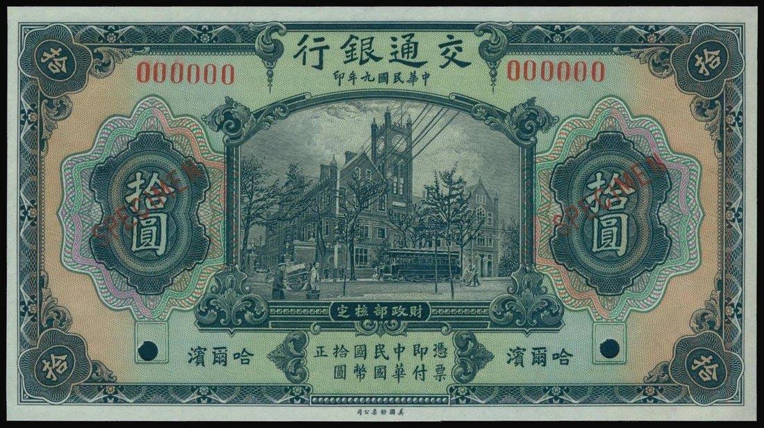 Bank of Communications, 10 yuan, specimen, Harbin, 1920, black, on green and orange, Customs Maritime Building at centre, reverse green, dockside scene at centre,