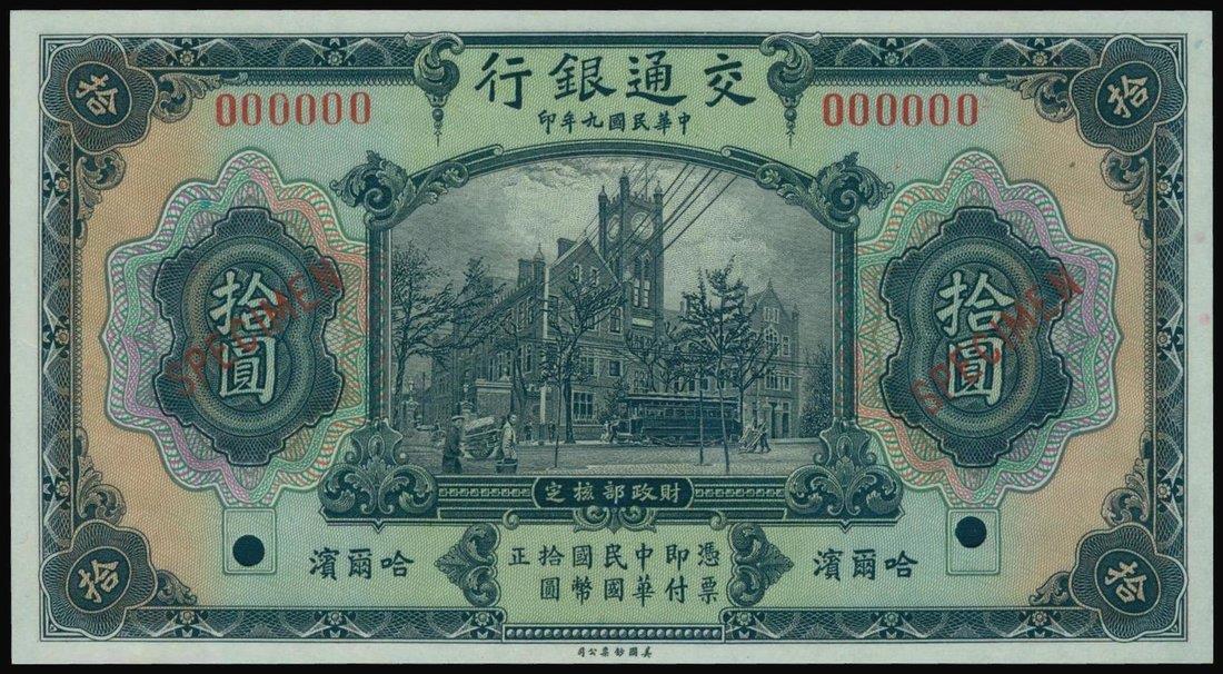 Bank of Communications, 10 yuan, specimen, Harbin, 1920, black, on green and orange, Customs Maritime Building at centre, reverse green, dockside scene at centre,
