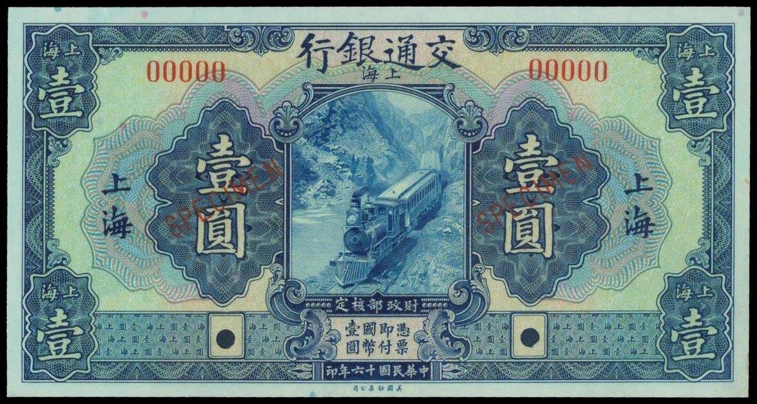 Bank of Communications,1 yuan, 1927, Shanghai, specimen,blue and multicolour underprint, steam train at centre, reverse blue and multicolour underprint,