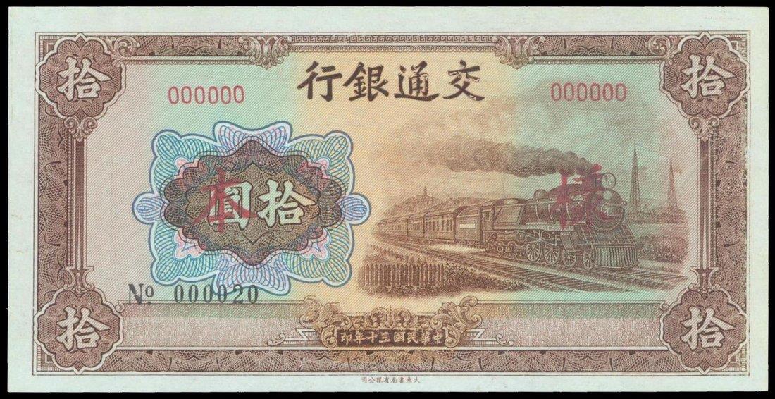Bank of Communications,10 yuan, 1941, specimen,brown on multicolour underprint, steam train at right, reverse brown, red ‘Specimen’ in Chinese and English overprinted,