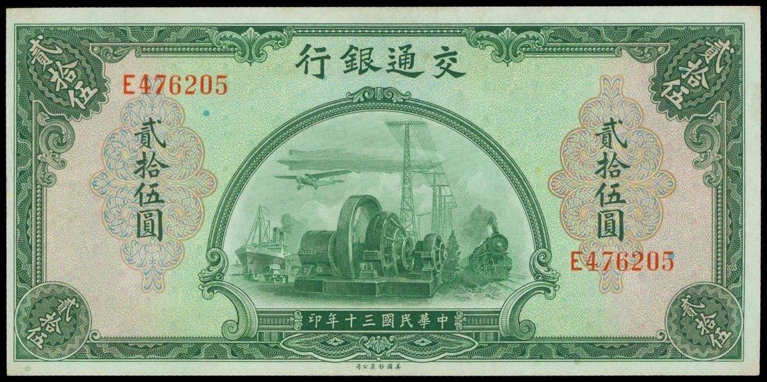 Bank of Communications,25 yuan, 1941, serial number E476205,green and multicolour underprint, machine, train, ship and airplane at centre, reverse green, airplane at centre,