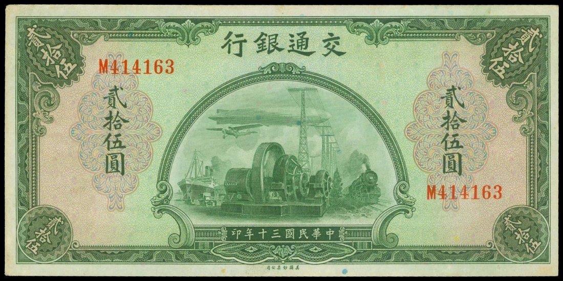 Bank of Communications,25 yuan, 1941, serial number M414163,green on multicolour underprint, machine, train, ship and airplane at certre, reverse green,