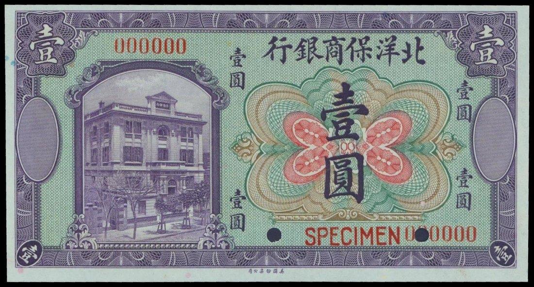 The Commercial Guarantee Bank of Chihli,$1, 1919, specimen,purple, green and multicolour, building at left, reverse purple,