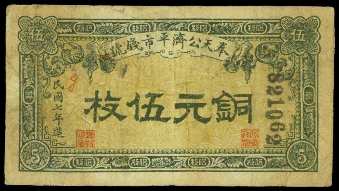Kung Tsi Bank of Fengtien,5 coppers, 1918, serial number 821062,small format, green and yellow, reverse green boat and mountain left and right,