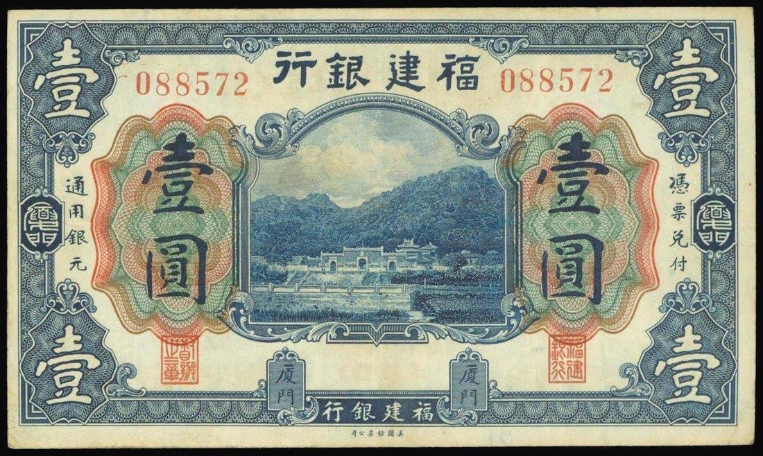 Fukien Bank,$1, ND, Amoy, serial number 088572,dark blue and multicolour, village by the mountain at centre, reverse blue,