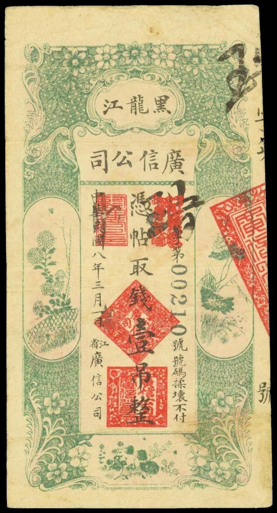 Kwang Sing Company,1 tiao, 1919, serial number 00210, vertical format, green, red seals, reverse red,